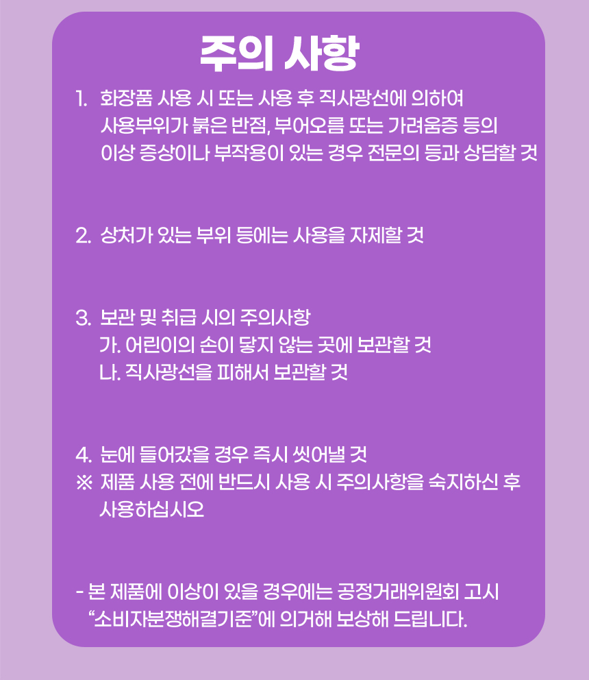 1. Khi sử dụng mỹ phẩm hoặc sau khi sử dụng bị nổi nốt đỏ hoặc sưng tấy vùng sử dụng do ánh nắng trực tiếp.Hoặc, nếu bạn có bất kỳ triệu chứng bất thường hoặc tác dụng phụ như ngứa, hãy tham khảo ý kiến bác sĩ chuyên khoa