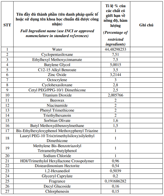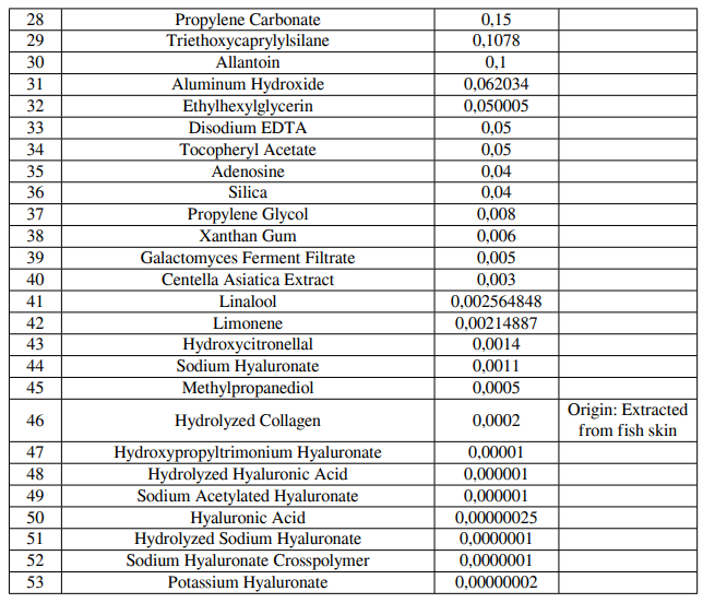 Độ chống nắng cao lên tới SPF50+/PA++++ gồm 4 thành phần chống nắng cao cấp không thể thiếu cho sản phẩm chống nắng đạt tiêu chuẩn chống tia UVA và UVB như: Titanium Dioxide, Zinc Oxide, Octocrylene, Ethylhexyl Methoxycinnamate. Đồng thời sản phẩm còn chứa 8 phức hợp “Hyaluronic” gồm: Sodium Hyaluronate, Hydroxypropyltrimonium Hyaluronate, Sodium Acetylated Hyaluronate, Hydrolyzed Hyaluronic Acid, Hyaluronic Acid, Sodium Hyaluronate Crosspolymer, Hydrolyzed Sodium Hyaluronate, Potassium Hyaluronate với kích thước phân tử nhỏ có thể thấm qua lớp biểu bì rất nhanh giúp da giữ nước & dưỡng ẩm sâu hơn. Từ đó, giúp mang đến bề mặt mịn màng, làm mờ nếp nhăn và các vết sạm nám, chống lão hóa da, giúp tăng độ đàn hồi da. Đồng thời thành phần Hydrolyzed Collagen là một loại collagen peptide được chiết xuất từ vảy cá, da cá thông qua quá trình thủy phân giúp cung cấp dưỡng chất sâu vào da và chất phân giải lên men Bifida tạo nên hàng rào bảo vệ da mạnh mẽ và đàn hồi hơn. Ngoài ra, nó còn tạo ra một môi trường cân bằng cho da làm cho quá trình tự điều chỉnh của da trở nên săn chắc, giúp tăng sức khỏe tự nhiên của da, điều tiết lượng dầu dư thừa, làm ẩm, làm mềm da, tăng sức đề kháng phục hồi làn da bị tổn thương.
