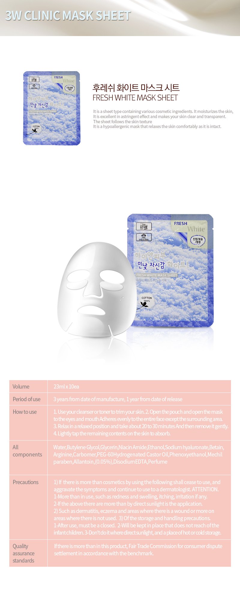 - Mặt nạ tuyết dưỡng trắng da 3W Clinic Fresh White Mask Sheet 23ml là mặt nạ dưỡng trắng của 3W Clinic.
