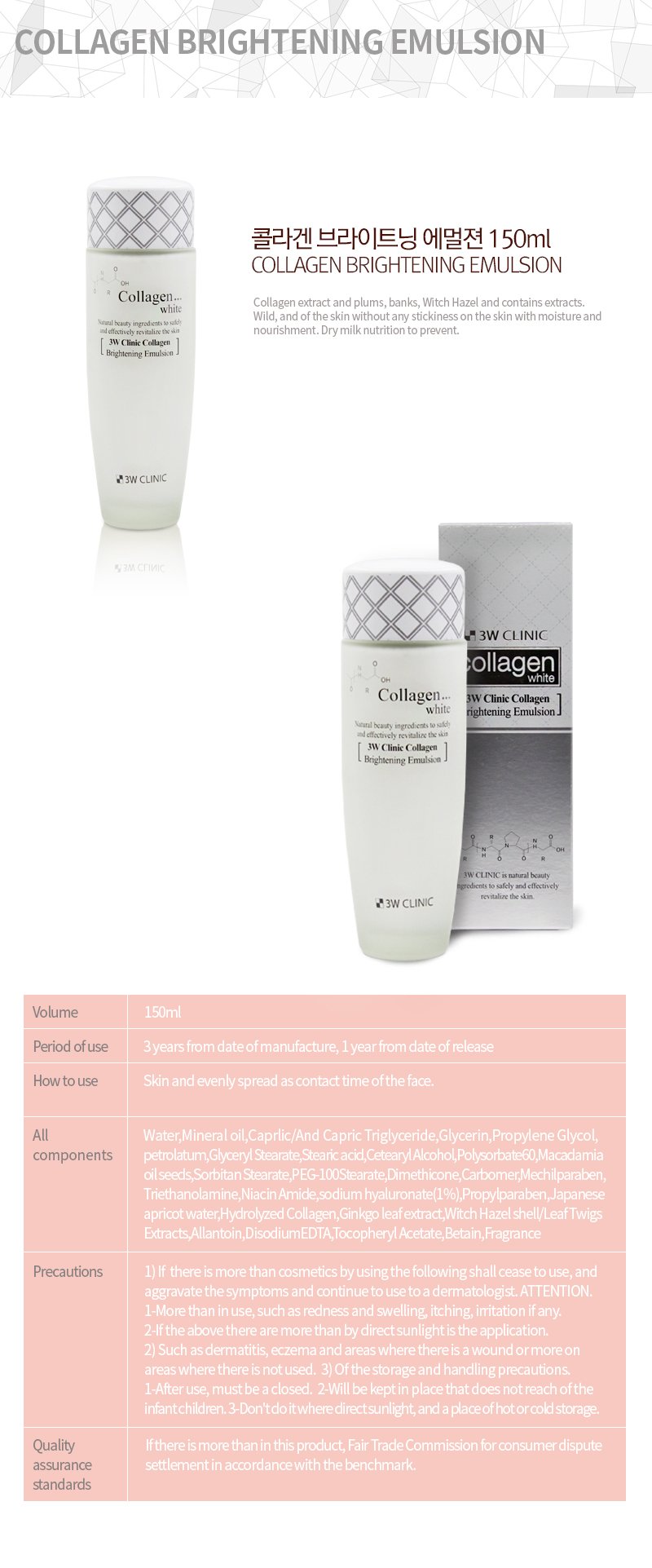 Sữa dưỡng trắng da Collagen 3W CLINIC COLLAGEN WHITE BRIGHTENING EMULSION