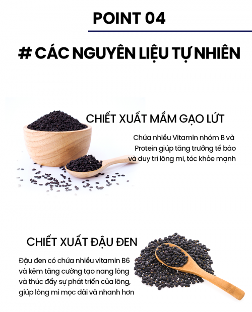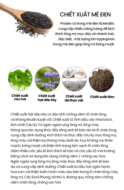 – Chứa nhiều dưỡng chất chiết xuất từ tự nhiên, Collagen chiết xuất từ vây cá, da cá biển, vitamin B7 giúp nuôi dưỡng lông mi, kích thích lông mi mọc dày và dài hơn. Sản phẩm còn chứa Collagen thủy phân Là một loại axit amin cấu thành protein, là thành phần chính của collagen và VITAMIN B7 Giúp hình thành lớp sừng và bảo vệ lỗ chân lông bên dưới da kích thích lông mi, lông mày mọc và khỏe mạnh