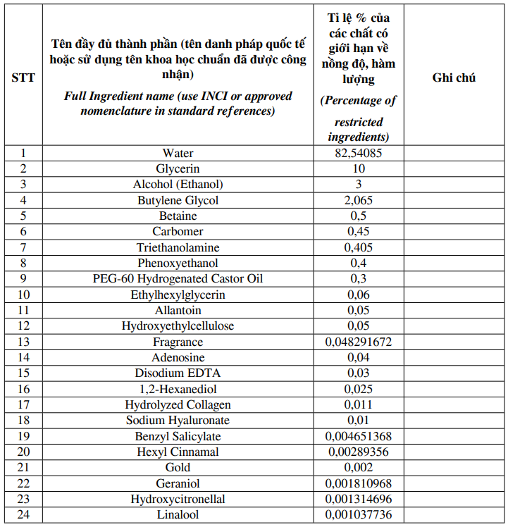- Chiết xuất từ vàng 24K, nhân sâm, trà xanh và các chất thiên nhiên giúp phục hồi da, tăng độ đàn hồi