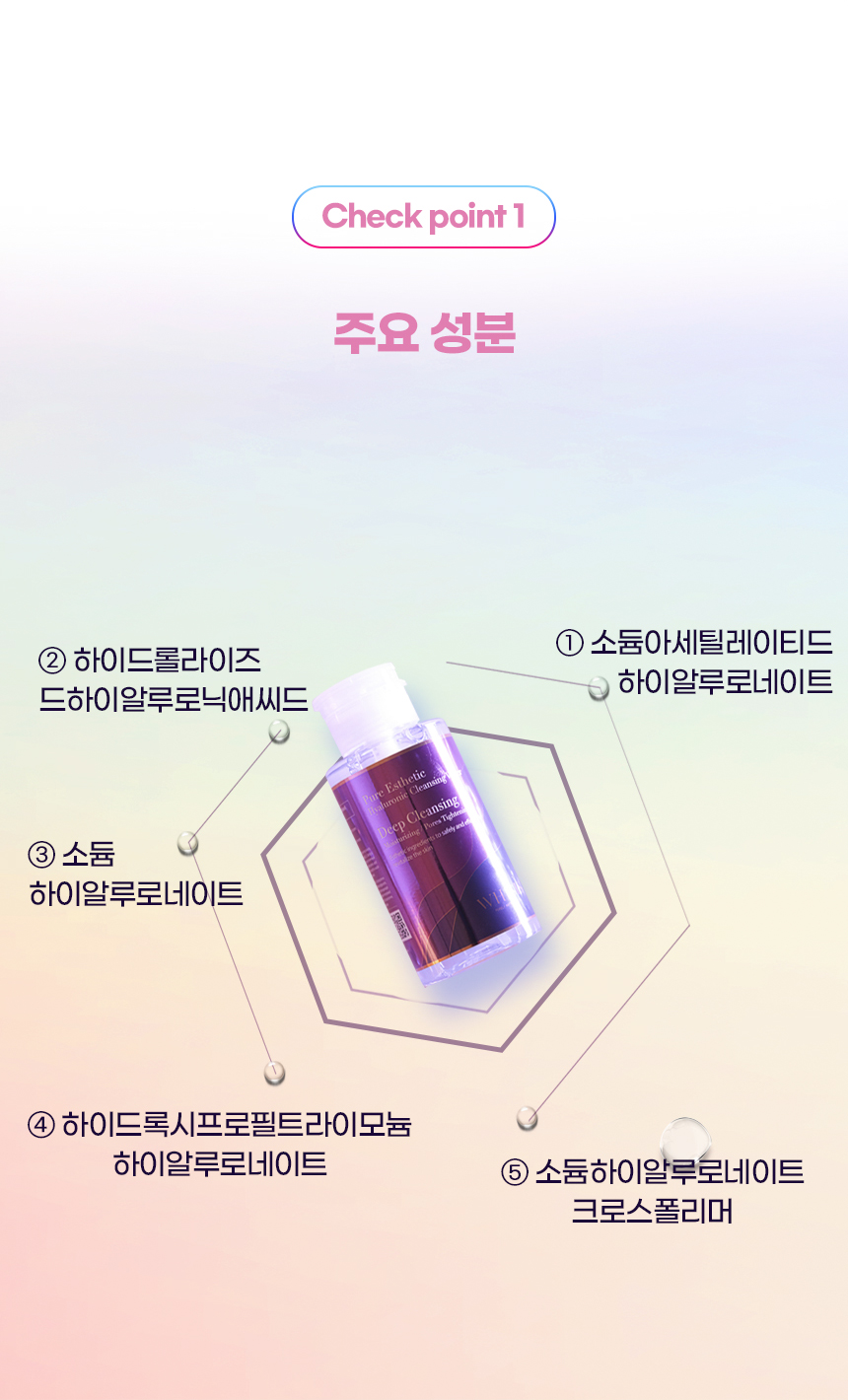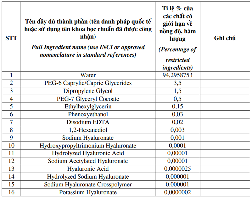 Nước tẩy trang tinh khiết Hyaluronic (HA) không chứa cồn, không những giúp loại bỏ lớp trang điểm mà còn làm sạch sâu lỗ chân lông,các cặn trang điểm và lớp tế bào da chết, giúp thu nhỏ lỗ chân lông. Sản phẩm chiết xuất tự nhiên và chứa thành phần Hyaluronic Acid (HA), lượng HA của mô da tập trung tại khu vực collagen ở lớp trung bì của làn da, HA đóng vai trò như nguồn dinh dưỡng chính nuôi lớp màng collagen. Nhờ có Hyaluronic mà các sợi collagen được chăm sóc, giúp da tăng độ đàn hồi, giảm thiểu các nếp nhăn. Cải thiện độ đàn hồi của da: Hyaluronic acid đi sâu vào da không những giúp nâng đỡ và cải thiện da. Mà còn kích thích quá trình tăng sinh collagen và elastin tăng độ đàn hồi, săn chắc, khắc phục tình trạng chảy xệ trả lại làn da căng bóng, chắc khỏe. Dưỡng ẩm và làm mềm da: Đóng vai trò như một chất liên kết tế bào, Hyaluronic Acid làm rất tốt nhiệm vụ của mình đó là giữ nước giúp da căng mọng. Không những thế, thành phần này còn đóng vai trò như một liều thuốc bổ tuyệt vời giúp nuôi dưỡng làn da sần sùi, thô ráp hiệu quả, trả lại vẻ láng mịn, tươi mới đầy sức sống. Ngăn ngừa lão hóa: Hyaluronic acid được xem như một trong những yếu tố quan trọng quyết định vẻ tươi trẻ của làn da. Khi làn da đủ ẩm, căng mọng sẽ ngăn ngừa được các dấu hiệu lão hóa sớm như vết nhăn nông hoặc nếp nhăn sâu hiệu quả. Ngăn ngừa lão hóa là công dụng tuyệt vời của Hyaluronic acid (HA) mà không phải ai cũng biết. Khả năng cấp và giữ nước cũng như chống nếp nhăn không thua kém bất kỳ thành phần nào.