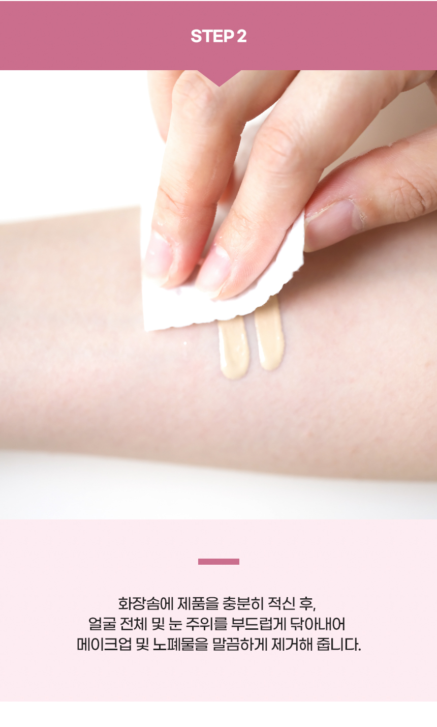 Bước 1. Sau khi thấm một miếng bông với sản phẩm, nhẹ nhàng lau toàn bộ khuôn mặt và quanh mắt để loại bỏ lớp trang điểm và tạp chất.