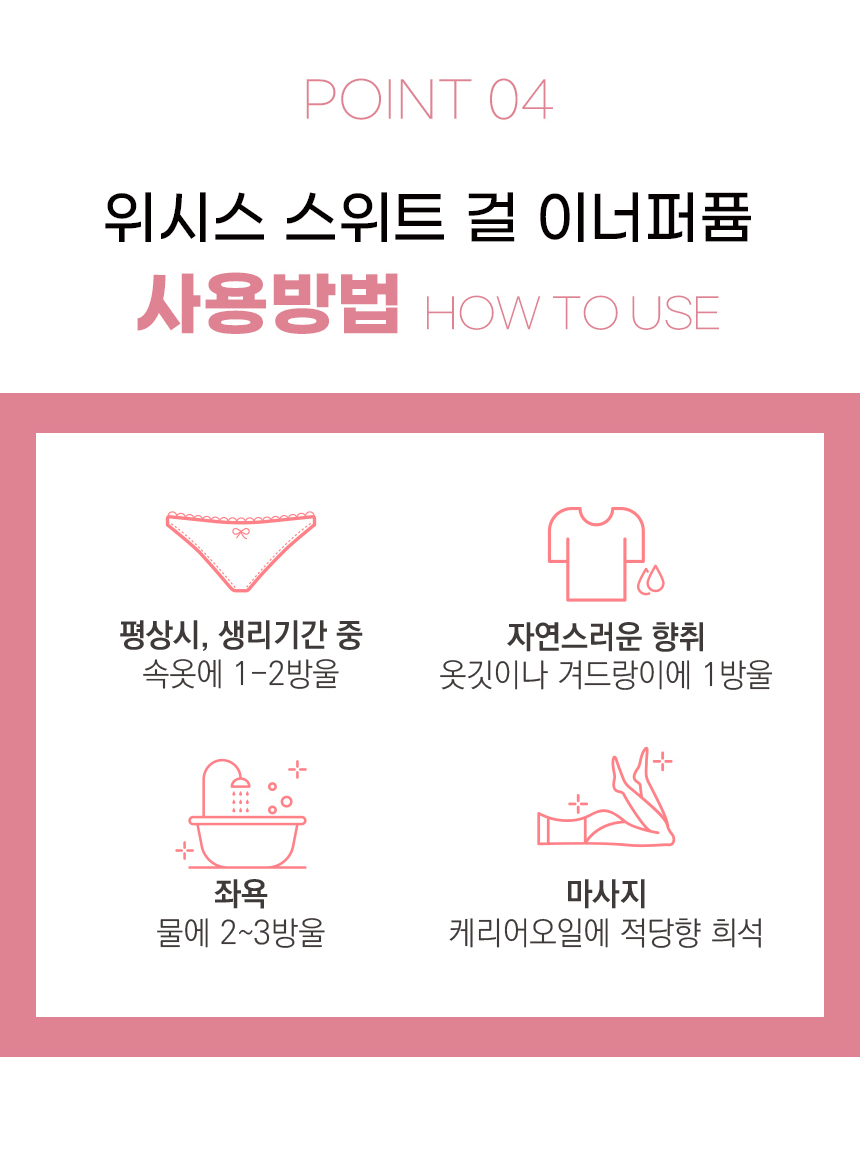 *Hằng ngày : nhỏ 1-2 giọt vào quần chíp giúp khử mùi và nhanh chóng toả hương hoặc xoa lên phần lông mu hoặc ''háng'' bẹn giúp lưu hương lâu hơn ở vùng kín
